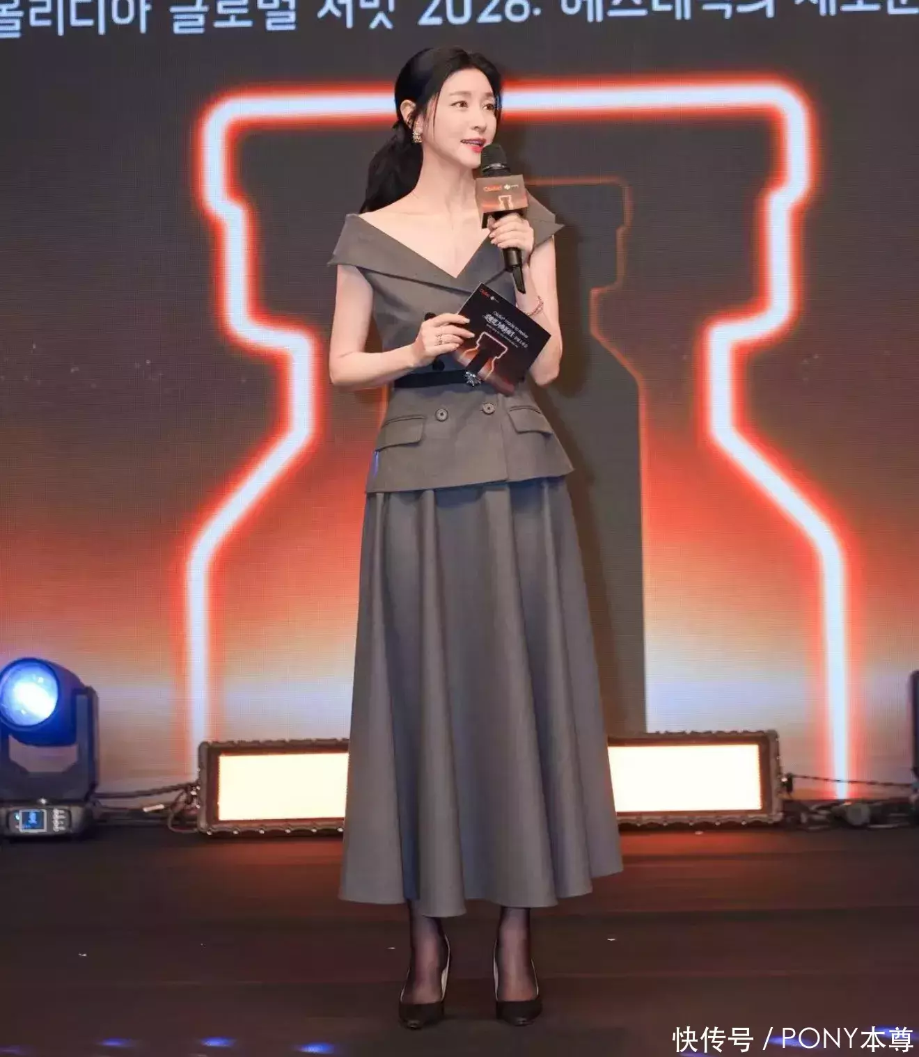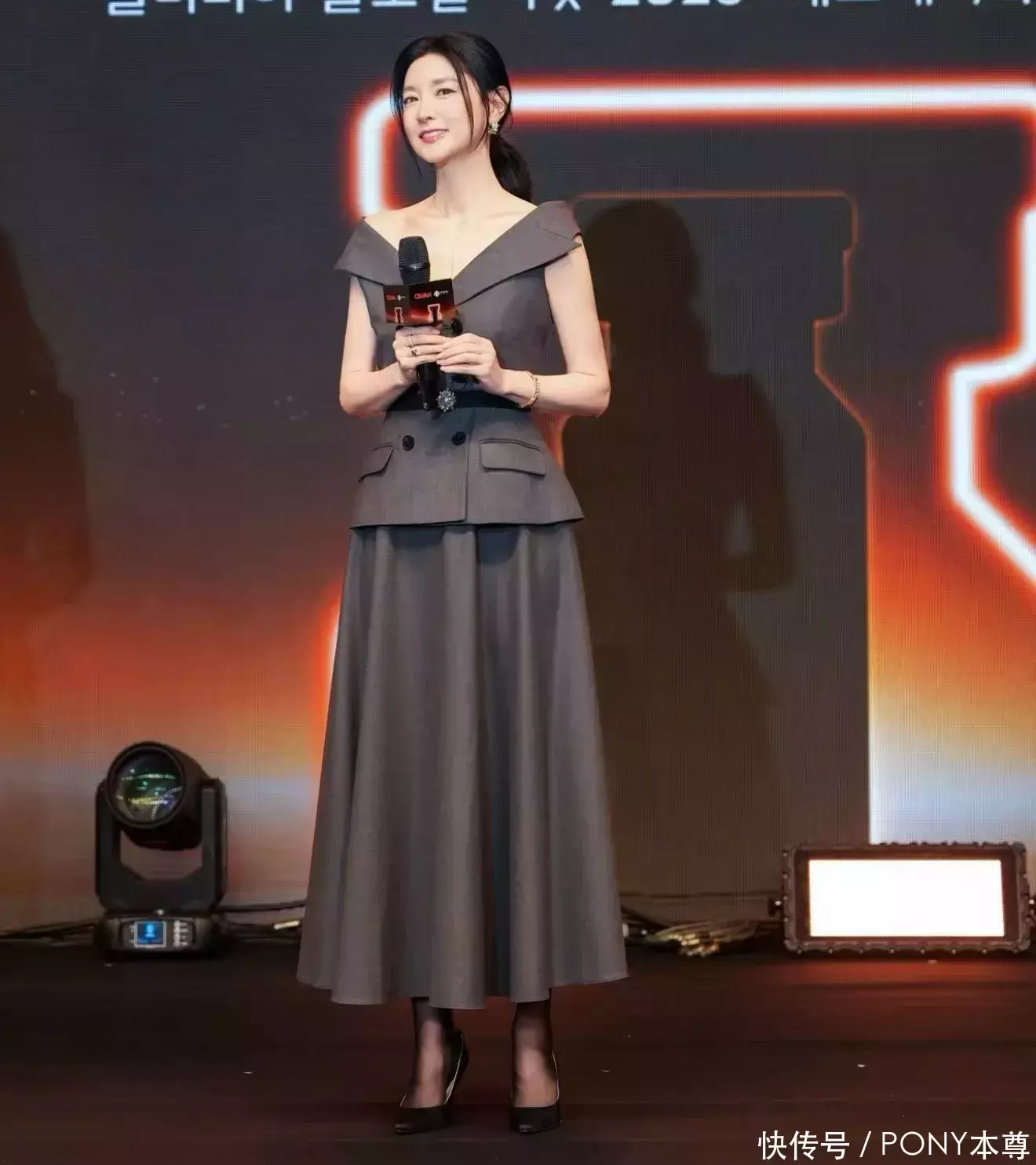 她的这套穿搭非常适合中年女性作为借鉴,灰色作为基础配色自带高级感,而露肩设计露出锁骨曲线,搭配优雅的仪态,散发着属于她这个年龄段的独特魅力!